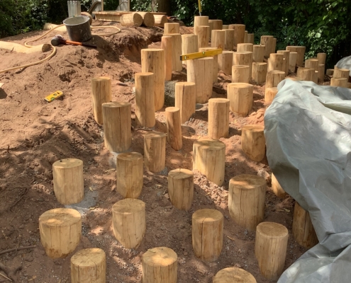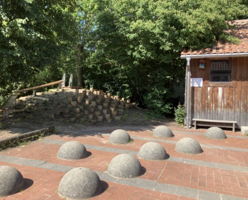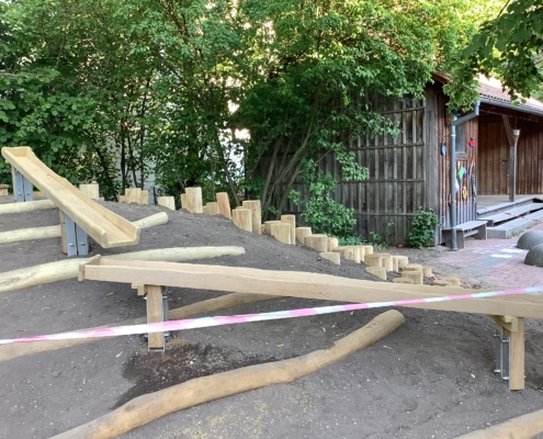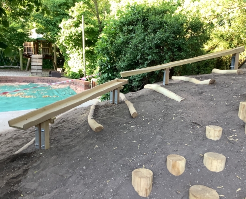 Zunächst wurde der Erdhügel aufgefüllt und vorbereitet, dann eine Motorik-Treppe eingebaut, eine neue Rutsche und eine Treppe gebaut…
