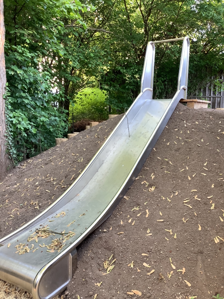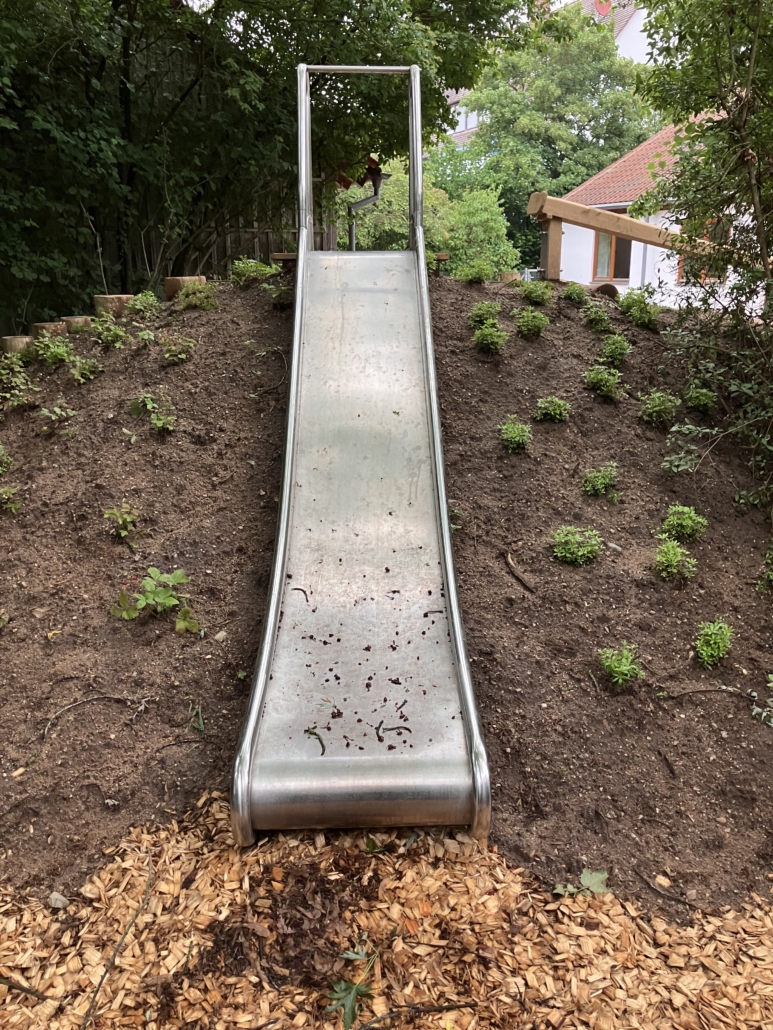 In der Kita Meisenbachstraße wurde ein ehemaliger Erd-Abraum-Hügel als Rutschenhügel für die Kinder genutzt. Über die Jahre nutzte sich dieser Spielort ab: die Rutsche war verschlissen und teilweise kaputt, der Abraumhügel hatte spitze, scharfkantige Steine an der Oberfläche, die eine Gefahr für die Kinder darstellten. Der Hügel musste daher für die Nutzung gesperrt werden.